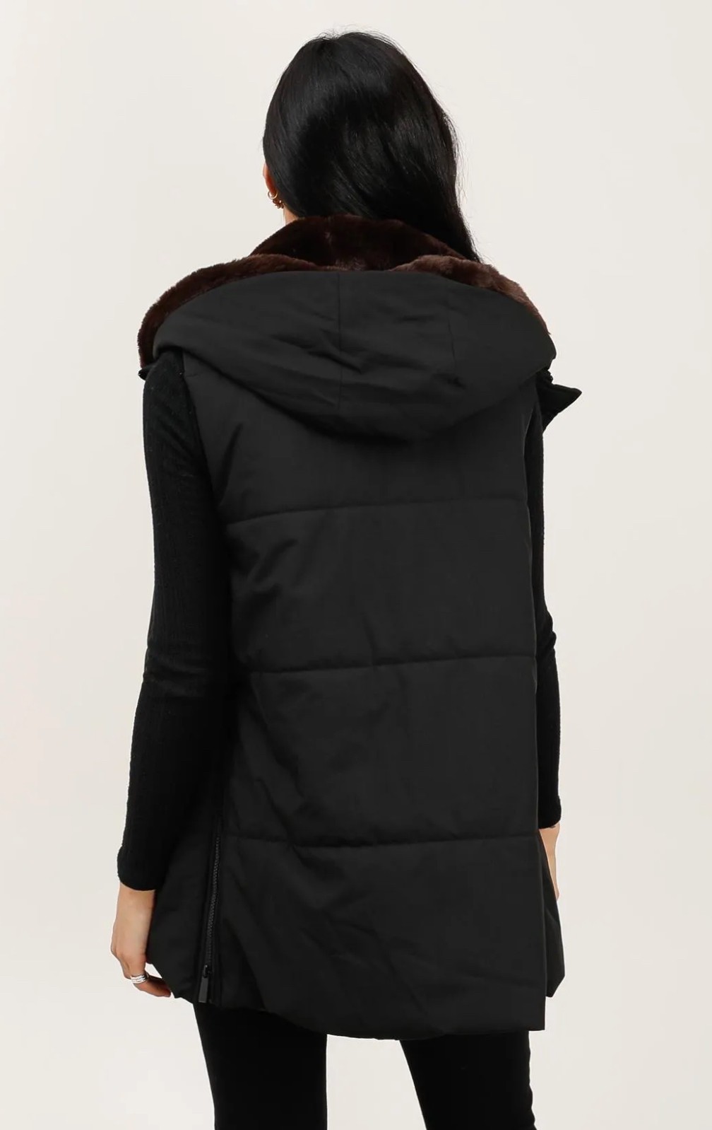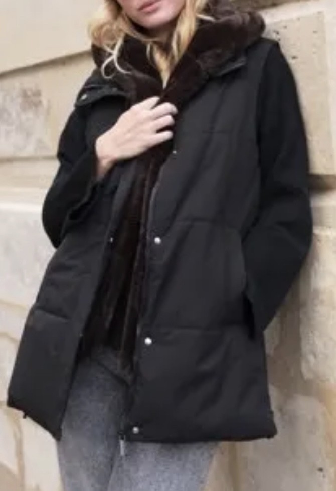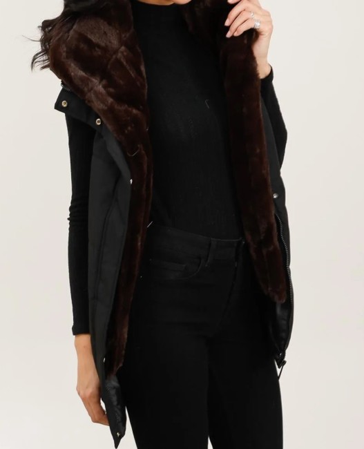 doudoune matelassée noire sans manches , fausse fourrure et capuche amovible
