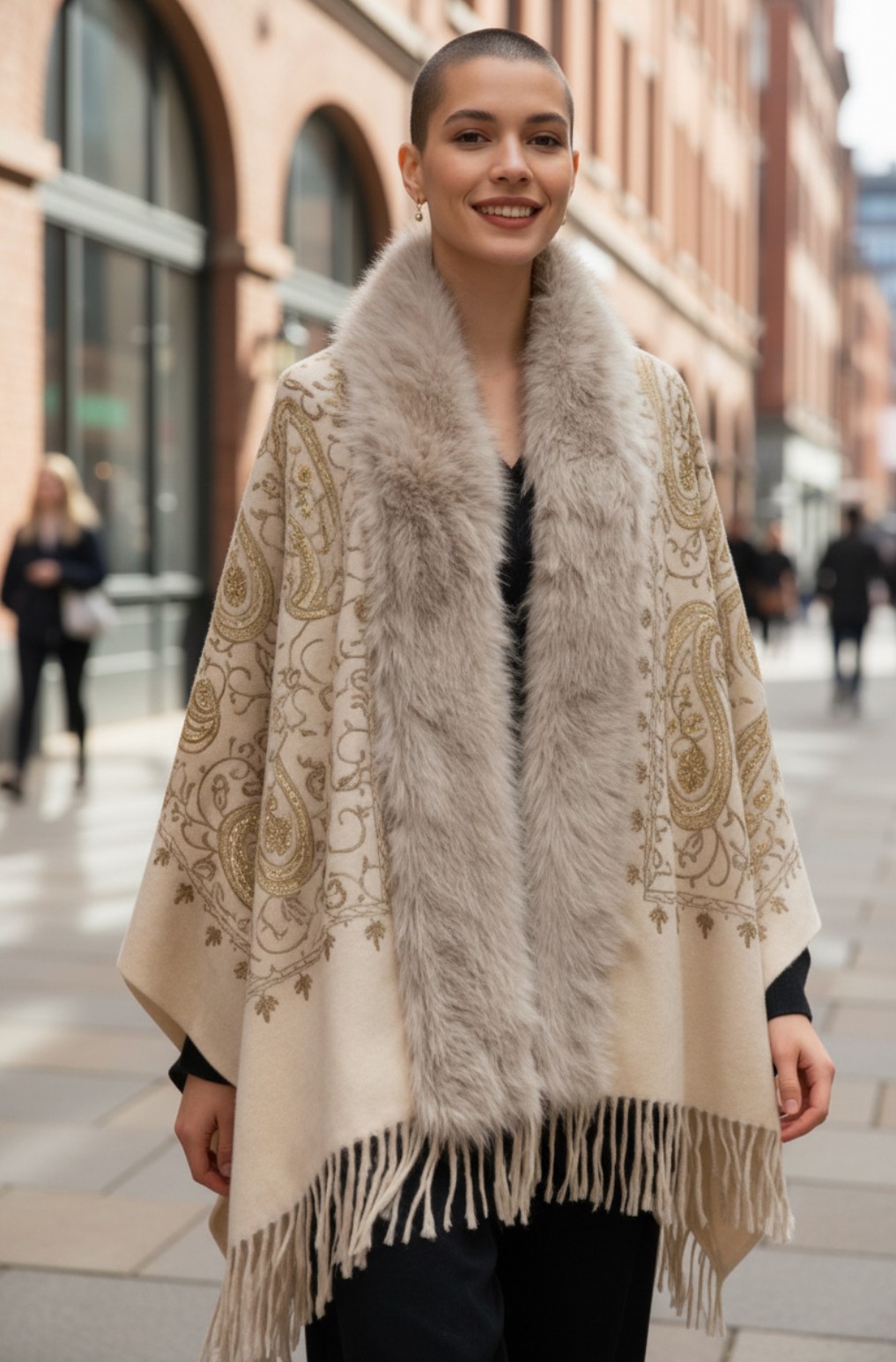Poncho écru imprimé doré et fausse fourrure