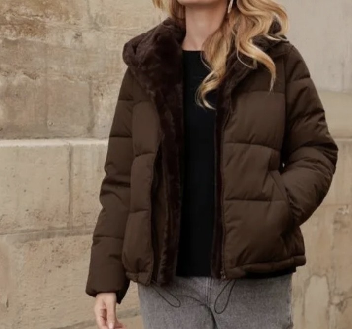 Veste doudoune courte marron au design pratique et raffiné.